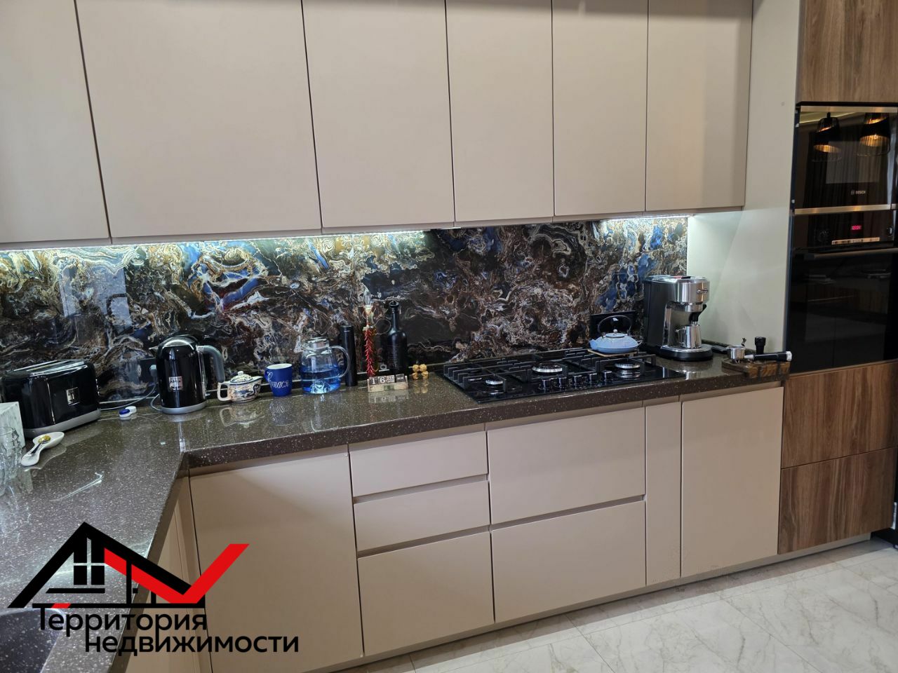 Кухня-столовая: Авторский проект со столешницей из камня и островом с бутылочницей. Вся техника встроена, скрыта, но всегда под рукой. Идеальное место для семейных завтраков и шумных застолий.