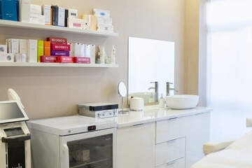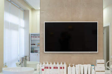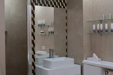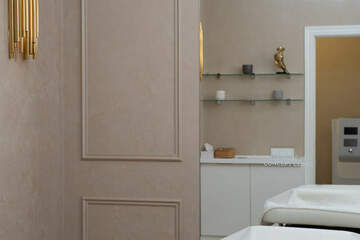 На полу плитка Италон, стены - декоративная моющаяся штукатурка Деруфа. Натяжной потолок подходит под медицинскую деятельность (имеется соответствующий сертификат).